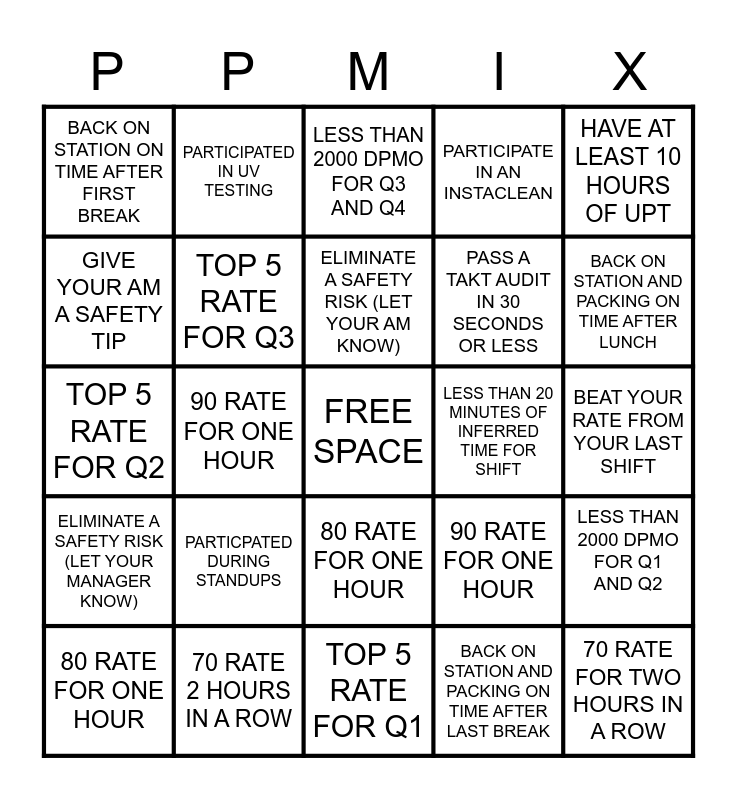 This bingo card has a free space and 24 words: PARTICPATED DURING STANDUPS, 70 RATE 2 HOURS IN A ROW, ELIMINATE A SAFETY RISK (LET YOUR AM KNOW), 80 RATE FOR ONE HOUR, HAVE AT LEAST 10 HOURS OF UPT, BACK ON STATION ON TIME AFTER FIRST BREAK, GIVE YOUR AM A SAFETY TIP, PARTICIPATED IN UV TESTING, LESS THAN 20 MINUTES OF INFERRED TIME FOR SHIFT, 80 RATE FOR ONE HOUR, PASS A TAKT AUDIT IN 30 SECONDS OR LESS, TOP 5 RATE FOR Q2, 90 RATE FOR ONE HOUR, LESS THAN 2000 DPMO FOR Q1 AND Q2, TOP 5 RATE FOR Q3, BACK ON STATION AND PACKING ON TIME AFTER LAST BREAK, BEAT YOUR RATE FROM YOUR LAST SHIFT, LESS THAN 2000 DPMO FOR Q3 AND Q4, BACK ON STATION AND PACKING ON TIME AFTER LUNCH, 90 RATE FOR ONE HOUR, 70 RATE FOR TWO HOURS IN A ROW, ELIMINATE A SAFETY RISK (LET YOUR MANAGER KNOW), PARTICIPATE IN AN INSTACLEAN and TOP 5 RATE FOR Q1.