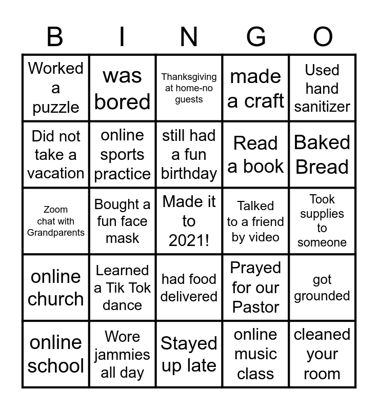 This bingo card has a free space and 29 words: online school, Picked up groceries, Bought a fun face mask, Prayed for my family, Worked a puzzle, Thanksgiving at home-no guests, online sports practice, Learned a Tik Tok dance, Talked to a friend by video, Wore jammies all day, Took supplies to someone, cleaned your room, Stayed up late, online music class, Baked Bread, Watched a lot of movies, had food delivered, online church, Used hand sanitizer, Zoom chat with Grandparents, Prayed for our Pastor, learned a new skill, Read a book, Did not take a vacation, made a craft, was bored, got grounded, still had a fun birthday and missed a friend.