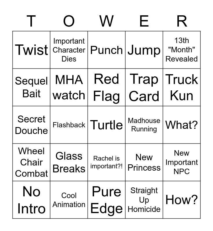 This bingo card has a free space and 29 words: No Intro, Song over Ending, Flashback, Smooch, Twist, Punch, MHA watch, Glass Breaks, Madhouse Running, Cool Animation, What?, How?, Pure Edge, Straight Up Homicide, Truck Kun, New Turtle Tech, Rachel is important?!, Wheel Chair Combat, 13th "Month" Revealed, Secret Douche, New Princess, Lo-Fi Battle, Trap Card, Sequel Bait, Jump, Important Character Dies, New Important NPC, Red Flag and King Zhad Reveal.