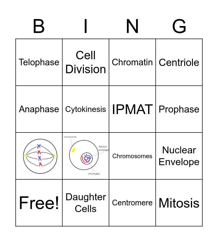 This bingo card has 5 images and 18 words: Mitosis, Interphase, Prophase, Metaphase, Anaphase, Telophase, Cytokinesis, Cell Division, Free!, Daughter Cells, Miotic Spindle, Chromatin, Chromosomes, IPMAT, Nuclear Envelope, Centriole, Centromere and Identical.