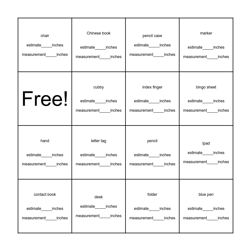 This bingo card has 16 words: desk estimate_____inches measurement_____inches, Ipad estimate_____inches measurement_____inches, pencil case estimate_____inches measurement_____inches, chair estimate_____inches measurement_____inches, hand estimate_____inches measurement_____inches, Chinese book estimate_____inches measurement_____inches, pencil estimate_____inches measurement_____inches, folder estimate_____inches measurement_____inches, Free!, cubby estimate_____inches measurement_____inches, contact book estimate_____inches measurement_____inches, marker estimate_____inches measurement_____inches, letter tag estimate_____inches measurement_____inches, bingo sheet estimate_____inches measurement_____inches, index finger estimate_____inches measurement_____inches and blue pen estimate_____inches measurement_____inches.