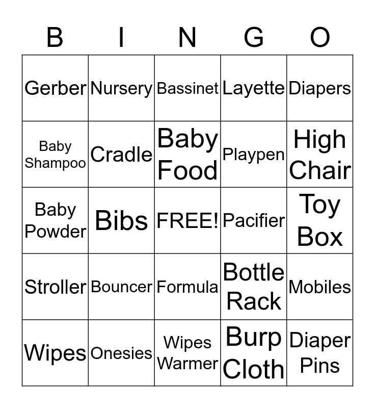 This bingo card has a free space and 24 words: Bouncer, Onesies, Baby Food, Wipes, Diapers, Gerber, Baby Shampoo, Nursery, Pacifier, Formula, Playpen, Baby Powder, Bottle Rack, Mobiles, Cradle, Burp Cloth, Toy Box, Bassinet, High Chair, Bibs, Diaper Pins, Stroller, Layette and Wipes Warmer.