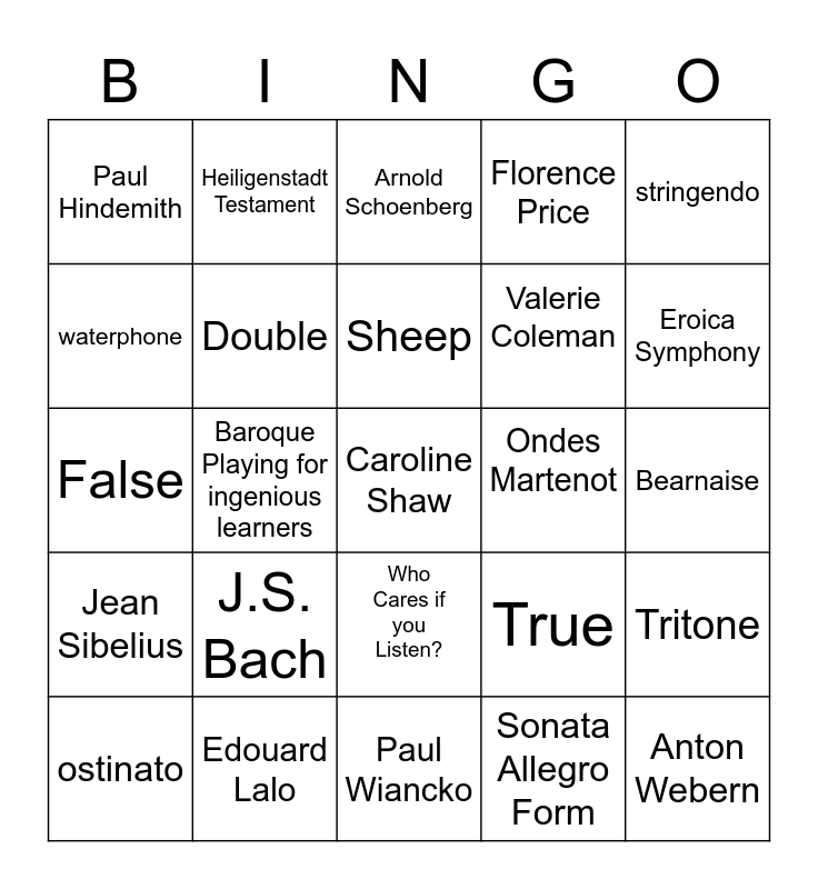 This bingo card has a free space and 24 words: J.S. Bach, Edouard Lalo, Sheep, ostinato, stringendo, Paul Hindemith, waterphone, Heiligenstadt Testament, Ondes Martenot, Who Cares if you Listen?, Valerie Coleman, False, True, Tritone, Double, Sonata Allegro Form, Bearnaise, Arnold Schoenberg, Eroica Symphony, Baroque Playing for ingenious learners, Anton Webern, Jean Sibelius, Florence Price and Paul Wiancko.