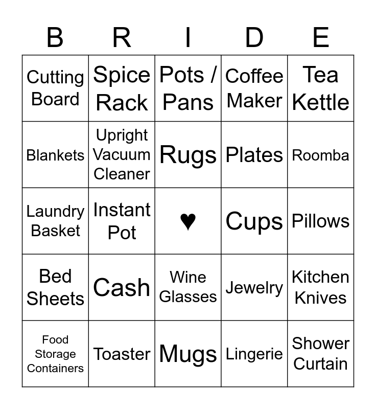 This bingo card has a free space and 59 words: Crock Pot, Toaster, Bath Towels, Bed Sheets, Lingerie, Cookbook, Upright Vacuum Cleaner, Blender, Plates, Air Fryer, Coffee Maker, Silverware, Blankets, Pot Holder, Kitchen Towels, Cutting Board, Shower Curtain, Tea Kettle, Bowls, Rugs, Cups, Pots / Pans, Food Storage Containers, Kitchen Knives, "Unmentionables" ;), Handheld Vacuum Cleaner, Can Opener, Microwave, Roomba, Waffle Maker, Rice Cooker, Bath Robes, Baking Sheet, Pyrex, Spice Rack, Amazon Echo, Cell Phone Charger, Instant Pot, Pressure Cooker, Laundry Basket, Gift Card, Cash, Pillows, Gag Gift, Beauty & the Beast Themed Gift, Wine, Wine Rack, Corkscrew, Wine Glasses, Mugs, Something Blue, Something Gold, Something Red, Something White, Lamp / Lighting, Jewelry, Cookie Cutters, Mop / Swiffer and Candles.