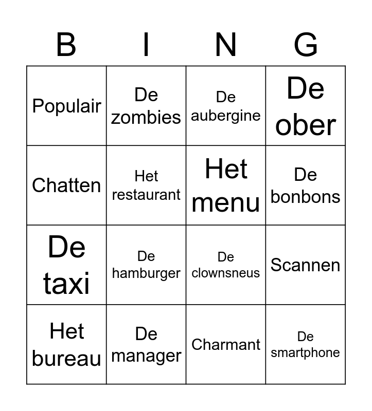 This bingo card has 44 words: De computer, Het bureau, Checken, De snorkel, De muesli, Het snowboard, De aubergine, Het toilet, Chatten, De garage, De ober, De manager, De gamewinkel, De commercial, De game, De magazines, Privé, De clownsneus, Het interieur, De hamburger, De zombies, De exemplaren, De toupet, Populair, De outfit, Charmant, Funshoppen, De gadgets, De celebrity, De smartphone, De croissant, De sandwich, De pistolet, De horloge, Scannen, De microfoon, De race, Het junkfood, De bonbons, Het restaurant, De taxi, De mayonaise, Het menu and De chips.