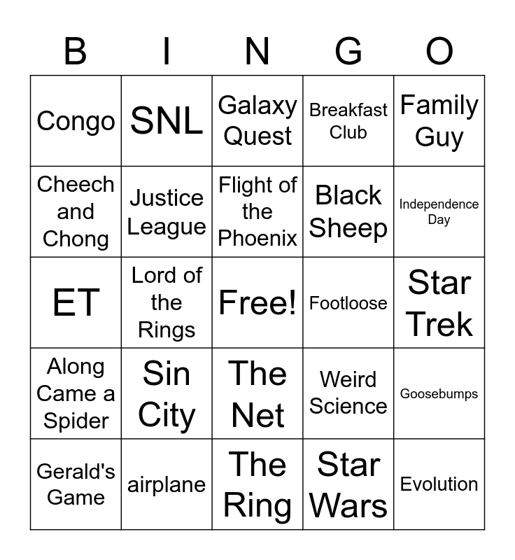 This bingo card has a free space and 59 words: Braveheart, airplane, Aladdin, Along Came a Spider, Star Wars, Australia, Justice League, Bob Newhart, Black Sheep, Blue Crush, Breakfast Club, Carrie, Cheech and Chong, Goonies, Conan the Barbarian, Congo, Evolution, Family Guy, Fire Marshall Bill, Flight of the Phoenix, Footloose, Galaxy Quest, Gerald's Game, Goosebumps, Green Lantern, Gremlins, Homer Simpson, I am Legend, Independence Day, Highlander, Jersey Girl, Kate & Leopold, T2, Masters of the Universe, SNL, The Lost Boys, Pee Wee's Big Adventure, Lord of the Rings, Quantum Leap, ET, Silverado, Sin City, Star Trek, Super 8, Swordfish, TMNT, Bourne Supremacy, Longest Yard, The Net, The Ring, Wonder Years, This is 40, Timeline, Transporter 2, Walk the Line, Weird Science, Remington Steele, Wild Wild West and Stand By Me.