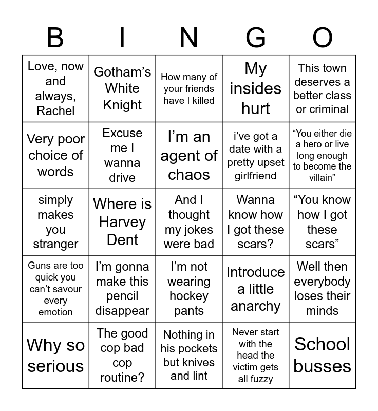 This bingo card has 42 words: WHERE ARE THEY, I’m an agent of chaos, I gotta make a phonecall, I’m gonna make this pencil disappear, Never start with the head the victim gets all fuzzy, Well then everybody loses their minds, And I thought my jokes were bad, Hit me!, How many of your friends have I killed, I’m not wearing hockey pants, “You know how I got these scars”, “You either die a hero or live long enough to become the villain”, Where is Harvey Dent, This town deserves a better class or criminal, Some men just wanna watch the world burn, Introduce a little anarchy, I don’t want to kill you, you complete me, simply makes you stranger, What doesn’t kill you, Gotham’s White Knight, Very poor choice of words, Its simple, we kill the Bat-Man, School busses, Love, now and always, Rachel, Do you really think I look like a guy with a plan, I didn’t sign up for this, i’ve got a date with a pretty upset girlfriend, Can’t hurt your chances, Wanna see a magic trick, Hahaha, Who did you leave him with, your people?, Guns are too quick you can’t savour every emotion, Excuse me I wanna drive, Nothing in his pockets but knives and lint, Not the hero we deserve, but the hero we need, Why so serious, The good cop bad cop routine?, Wanna know how I got these scars?, Now there’s a Bat-Man, Let’s put a smile on that face, My insides hurt and I make my own luck.