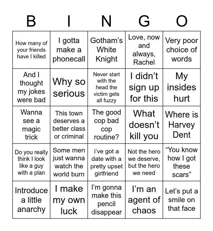 This bingo card has 42 words: Hahaha, Never start with the head the victim gets all fuzzy, Guns are too quick you can’t savour every emotion, Some men just wanna watch the world burn, I’m an agent of chaos, “You know how I got these scars”, The good cop bad cop routine?, WHERE ARE THEY, Gotham’s White Knight, i’ve got a date with a pretty upset girlfriend, Where is Harvey Dent, My insides hurt, This town deserves a better class or criminal, Very poor choice of words, Hit me!, Not the hero we deserve, but the hero we need, I’m not wearing hockey pants, Wanna see a magic trick, simply makes you stranger, I gotta make a phonecall, And I thought my jokes were bad, Nothing in his pockets but knives and lint, Let’s put a smile on that face, How many of your friends have I killed, Well then everybody loses their minds, Wanna know how I got these scars?, I didn’t sign up for this, I don’t want to kill you, you complete me, Excuse me I wanna drive, Who did you leave him with, your people?, “You either die a hero or live long enough to become the villain”, Do you really think I look like a guy with a plan, Why so serious, I’m gonna make this pencil disappear, Its simple, we kill the Bat-Man, Introduce a little anarchy, I make my own luck, What doesn’t kill you, Can’t hurt your chances, School busses, Love, now and always, Rachel and Now there’s a Bat-Man.
