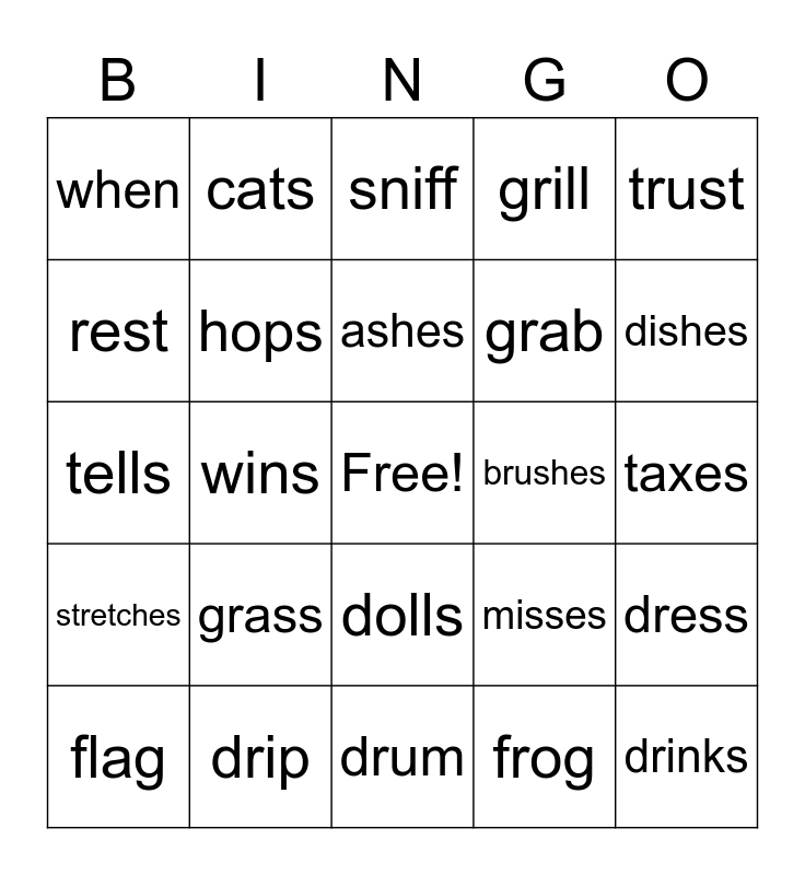 This bingo card has a free space and 24 words: grass, drip, ashes, flag, trust, when, rest, cats, brushes, dolls, grab, tells, misses, dress, hops, frog, taxes, sniff, dishes, wins, drinks, stretches, grill and drum.
