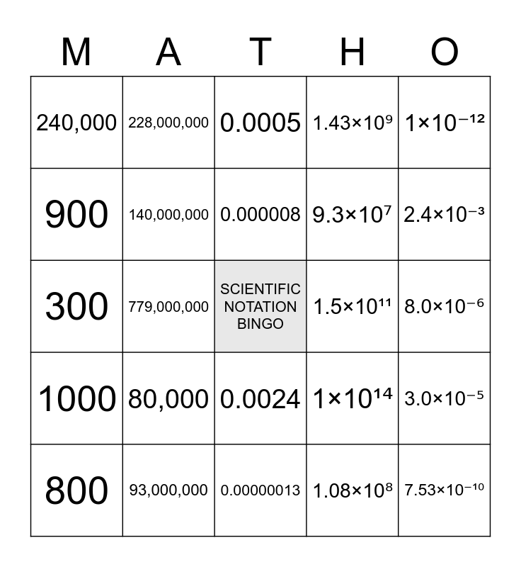 This bingo card has a free space and 24 words: 800, 80,000, 0.000008, 1.08×10⁸, 1×10⁻¹², 240,000, 228,000,000, 0.0005, 1.5×10¹¹, 8.0×10⁻⁶, 300, 140,000,000, 1×10¹⁴, 3.0×10⁻⁵, 900, 93,000,000, 0.00000013, 1.43×10⁹, 2.4×10⁻³, 1000, 779,000,000, 0.0024, 9.3×10⁷ and 7.53×10⁻¹⁰.