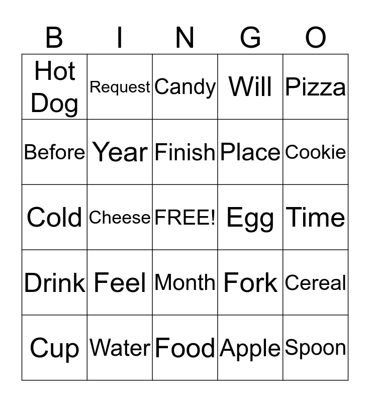 This bingo card has a free space and 35 words: Day, Night, Week, Year, Month, Will, Before, Today, Finish, Hot, Cold, Pizza, Milk, Hamburger, Hot Dog, Egg, Apple, Cheese, Drink, Spoon, Fork, Cup, Cereal, Water, Candy, Cookie, Hungry, Family, Place, Time, Temperature, Food, Feel, Request and Color.