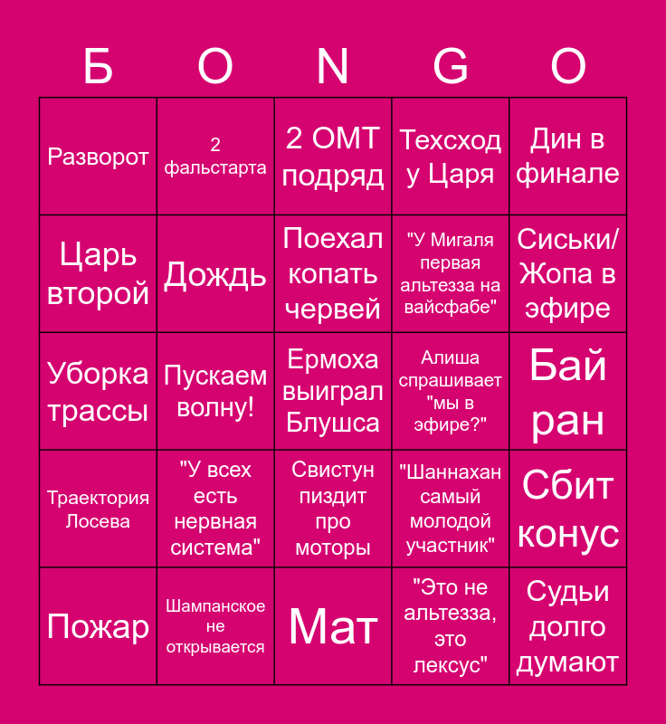 This bingo card has 25 words: "У всех есть нервная система", Мат, Поехал копать червей, Пожар, Дин в финале, Разворот, Царь второй, 2 фальстарта, Алиша спрашивает "мы в эфире?", Свистун пиздит про моторы, "У Мигаля первая альтезза на вайсфабе", Уборка трассы, "Шаннахан самый молодой участник", Сбит конус, Дождь, Судьи долго думают, Бай ран, 2 ОМТ подряд, Сиськи/Жопа в эфире, Пускаем волну!, Ермоха выиграл Блушса, Шампанское не открывается, Траектория Лосева, Техсход у Царя and "Это не альтезза, это лексус".