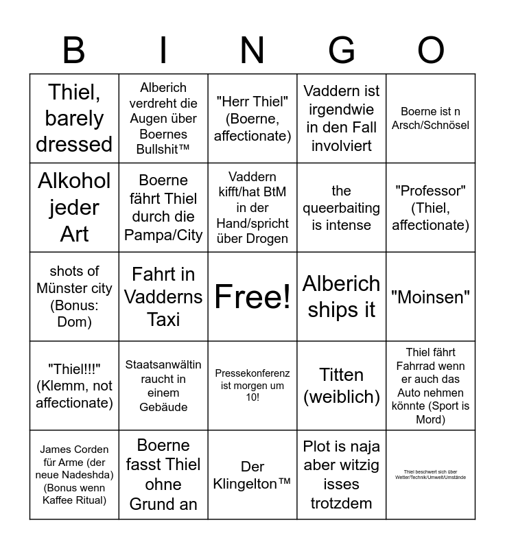 This bingo card has a free space and 24 words: Staatsanwältin raucht in einem Gebäude, Boerne fasst Thiel ohne Grund an, Vaddern kifft/hat BtM in der Hand/spricht über Drogen, James Corden für Arme (der neue Nadeshda)(Bonus wenn Kaffee Ritual), Boerne ist n Arsch/Schnösel, Thiel, barely dressed, Alkohol jeder Art, Alberich verdreht die Augen über Boernes Bullshit™️, Alberich ships it, Pressekonferenz ist morgen um 10!, the queerbaiting is intense, shots of Münster city (Bonus: Dom), Titten (weiblich), Thiel fährt Fahrrad wenn er auch das Auto nehmen könnte (Sport is Mord), Boerne fährt Thiel durch die Pampa/City, Plot is naja aber witzig isses trotzdem, "Moinsen", "Herr Thiel" (Boerne, affectionate), "Professor" (Thiel, affectionate), Fahrt in Vadderns Taxi, Thiel beschwert sich über Wetter/Technik/Umwelt/Umstände, "Thiel!!!" (Klemm, not affectionate), Vaddern ist irgendwie in den Fall involviert and Der Klingelton™️.