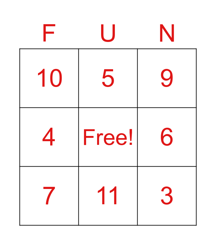 This bingo card has a free space and 12 words: 1, 2, 3, 4, 5, 6, 7, 8, 9, 10, 11 and 12.