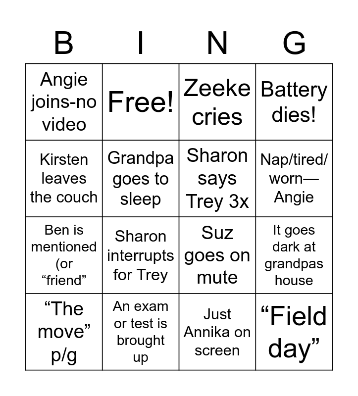 This bingo card has 19 words: Suz goes on mute, Patty or Greg joins on mute, Zeeke cries, “Field day”, It goes dark at grandpas house, Kirsten leaves the couch, Just Annika on screen, Angie joins-no video, Free!, Ben is mentioned (or “friend”, Sharon interrupts for Trey, Grandpa goes to sleep, Sharon says Trey 3x, An exam or test is brought up, “The move” p/g, “Can I show you something” Annika, Battery dies!, Nap/tired/ worn—Angie and Pancakes.