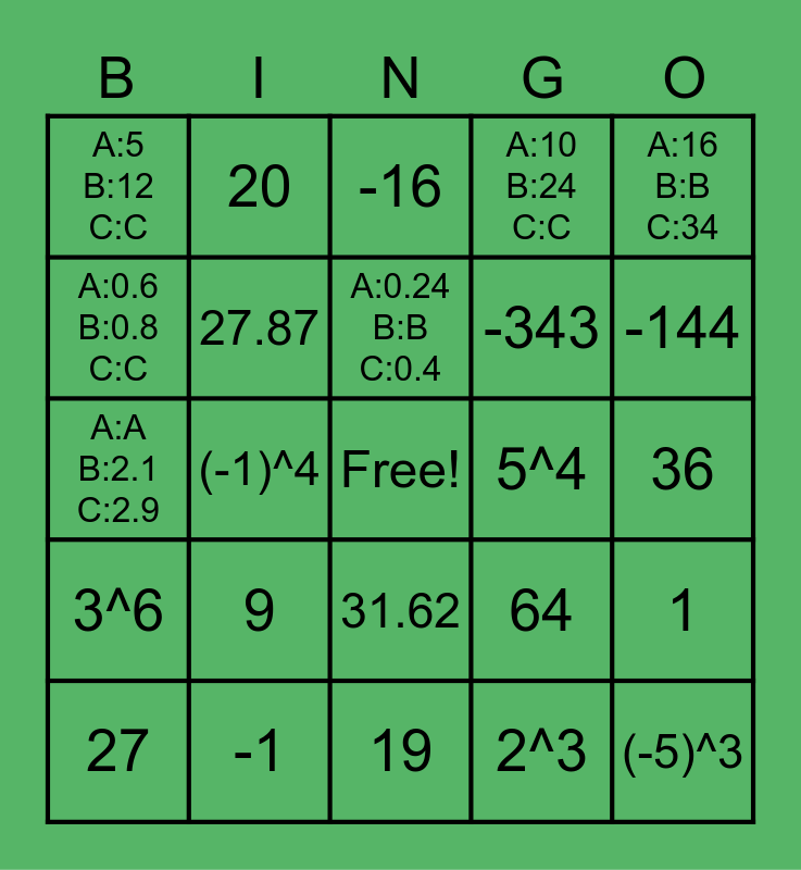 This bingo card has a free space and 35 words: 21.07, 12.49, 22.36, 27.87, 31.62, A:10 B:24 C:C, A:0.6 B:0.8 C:C, A:A B:16 C:20, A:0.24 B:B C:0.4, A:8 B:15 C:C, A:A B:2.1 C:2.9, A:16 B:B C:34, A:A B:9.6 C:10.4, A:9 B:B C:5, A:5 B:12 C:C, 5^4, 2^3, (-1)^4, 3^6, (-5)^3, 64, 27, 1, -1, -16, -144, -27, 1296, -343, 36, 14, 19, 9, 20 and 17.