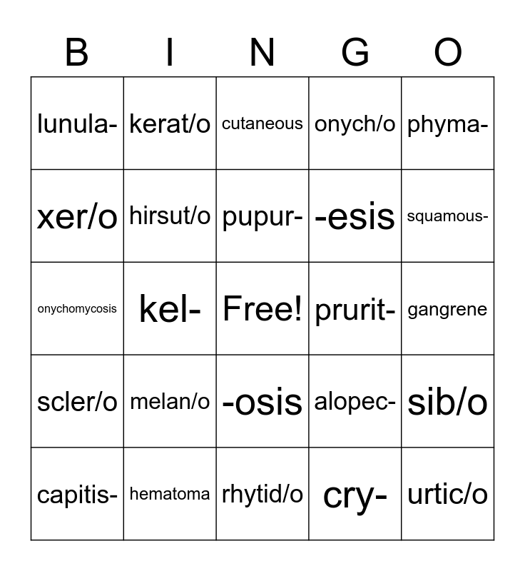 This bingo card has a free space and 49 words: Cutane/o, urtic/o, hidr/o, rhytid/o, melan/o, lip/o, kerat/o, dermat/o, xer/o, myc/o, hirsut/o, onych/o, sib/o, alopec-, contus-, ecchym-, pupur-, prurit-, ichthy-, phyma-, kel-, cry-, lunula-, -esis, phor-, squamous-, capitis-, onych/o, -osis, scler/o, -derma, -ectomy, -ous, alopecia, hematoma, diaphoresis, karatin, impetigo, gangrene, albinism, contusion, psoriasis, abscess, hyperhidrosis, onychomycosis, cutaneous, rhytidectomy, acne vulgaris and dermatologist.