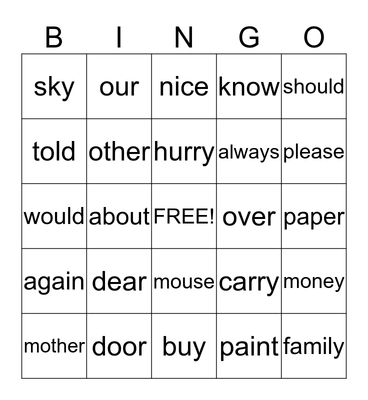 This bingo card has a free space and 24 words: dear, door, hurry, mother, should, sky, told, our, over, mouse, always, would, carry, money, other, paint, paper, nice, please, about, family, again, know and buy.