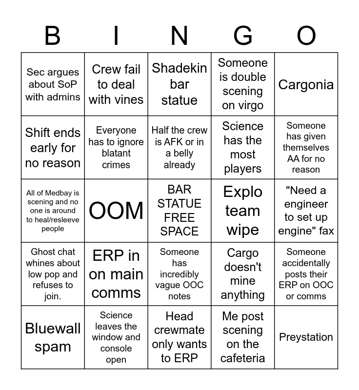 This bingo card has a free space and 24 words: ERP in on main comms, Science leaves the window and console open, Half the crew is AFK or in a belly already, Bluewall spam, Cargonia, Sec argues about SoP with admins, Shift ends early for no reason, Crew fail to deal with vines, Explo team wipe, Someone has incredibly vague OOC notes, Science has the most players, All of Medbay is scening and no one is around to heal/resleeve people, Cargo doesn't mine anything, Someone accidentally posts their ERP on OOC or comms, Everyone has to ignore blatant crimes, Me post scening on the cafeteria, "Need a engineer to set up engine" fax, Shadekin bar statue, Someone has given themselves AA for no reason, OOM, Preystation, Ghost chat whines about low pop and refuses to join., Someone is double scening on virgo and Head crewmate only wants to ERP.