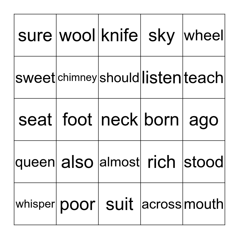 This bingo card has a free space and 24 words: also, poor, should, whisper, wheel, sure, sweet, wool, born, almost, listen, seat, rich, stood, chimney, across, ago, knife, teach, foot, mouth, queen, sky and suit.