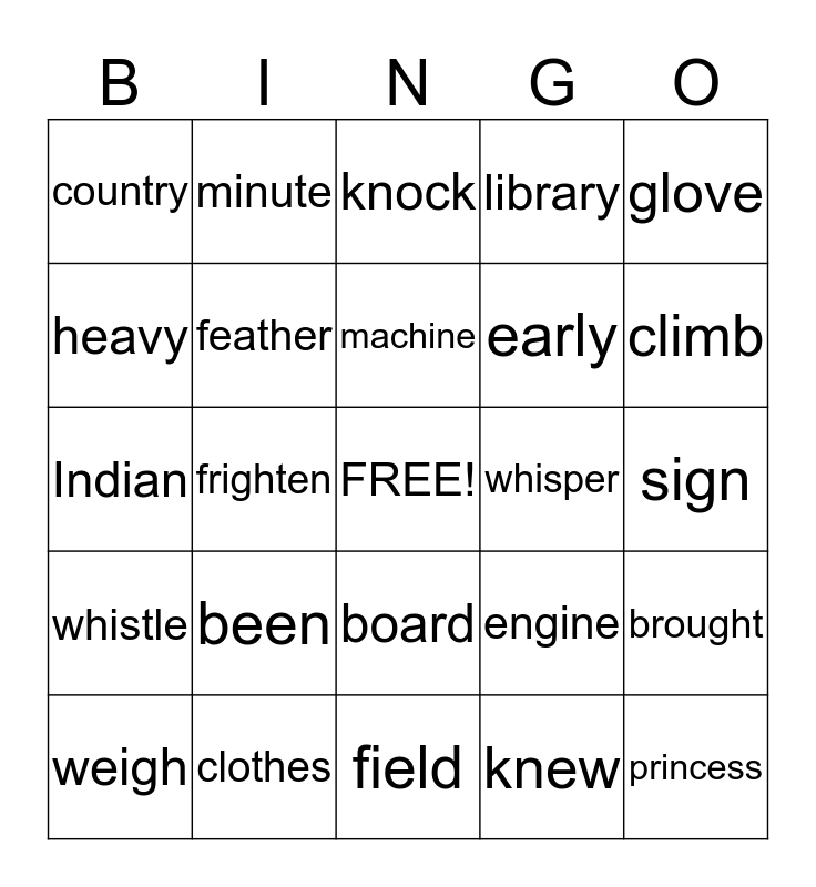 This bingo card has a free space and 24 words: been, clothes, machine, weigh, glove, country, heavy, minute, whisper, board, early, Indian, engine, brought, feather, knew, sign, knock, climb, frighten, princess, whistle, library and field.