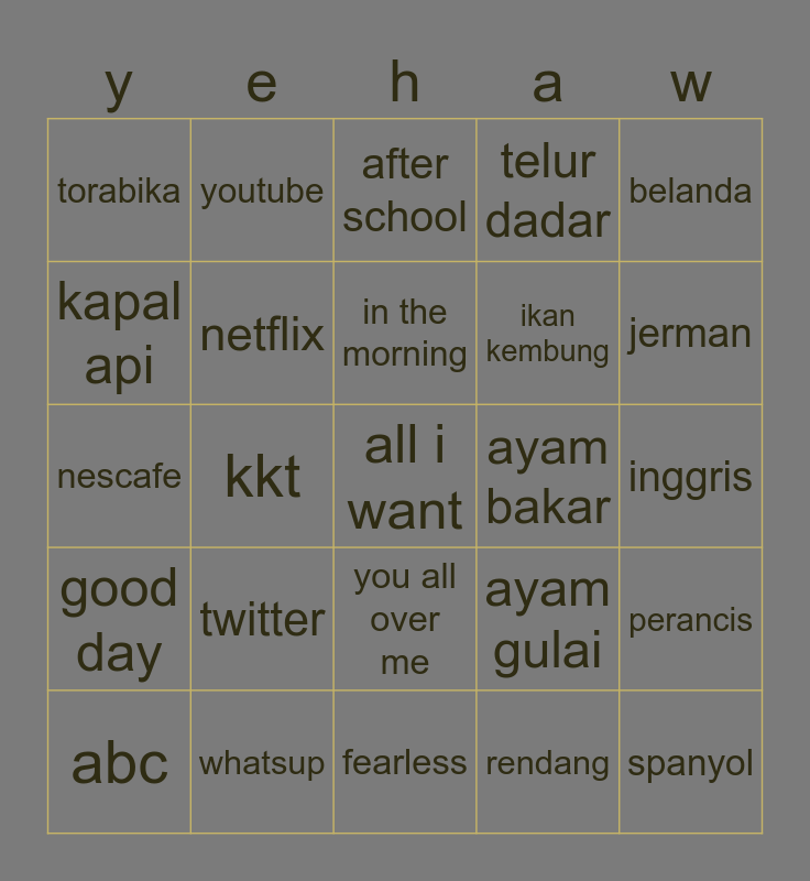 This bingo card has a free space and 24 words: abc, twitter, in the morning, rendang, belanda, torabika, youtube, after school, ayam bakar, inggris, nescafe, netflix, ayam gulai, perancis, kapal api, whatsup, fearless, telur dadar, jerman, good day, kkt, you all over me, ikan kembung and spanyol.