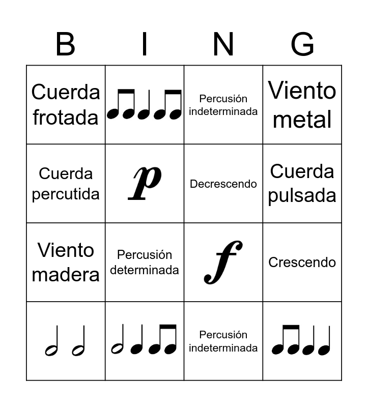 This bingo card has 6 images and 10 words: Crescendo, Percusión indeterminada, Cuerda frotada, Viento madera, Percusión indeterminada, Cuerda percutida, Viento metal, Percusión determinada, Cuerda pulsada and Decrescendo.