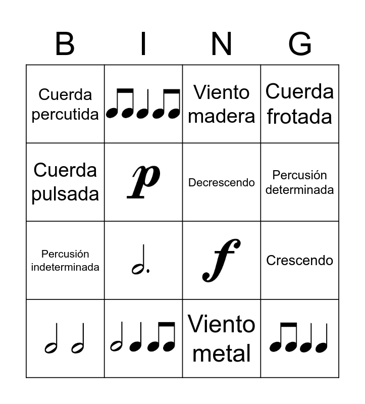 This bingo card has 7 images and 9 words: Crescendo, Viento madera, Cuerda percutida, Percusión indeterminada, Viento metal, Cuerda pulsada, Cuerda frotada, Percusión determinada and Decrescendo.