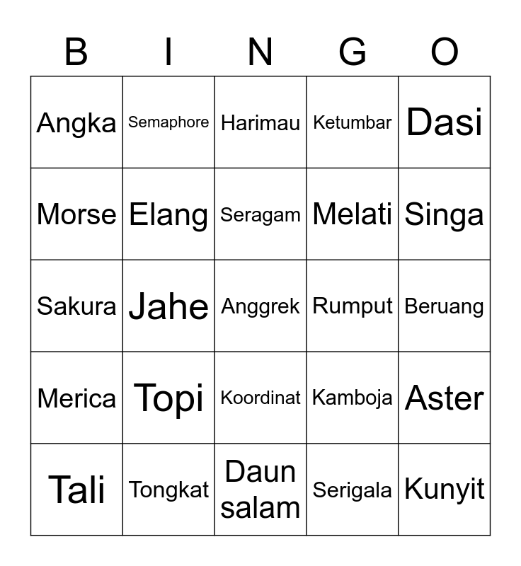 This bingo card has a free space and 24 words: Topi, Tongkat, Seragam, Tali, Dasi, Angka, Morse, Semaphore, Rumput, Koordinat, Melati, Sakura, Kamboja, Aster, Elang, Serigala, Beruang, Harimau, Singa, Jahe, Kunyit, Merica, Ketumbar and Daun salam.
