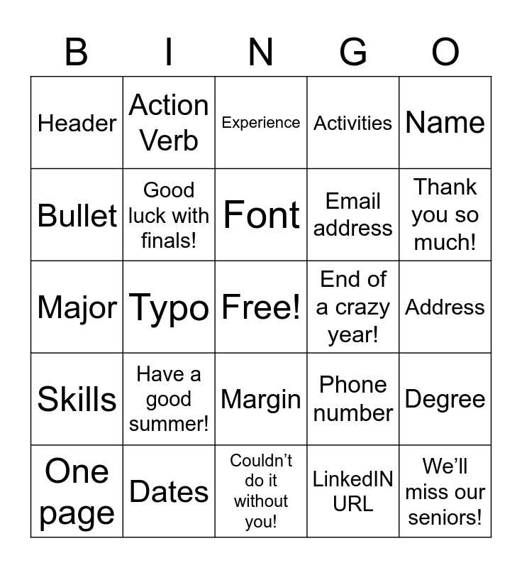 This bingo card has a free space and 26 words: Margin, LinkedIN URL, Font, Dates, Name, Header, Bullet, Action Verb, Address, Phone number, Email address, Major, Degree, One page, Typo, Education, Activities, Skills, Experience, We’ll miss our seniors!, Thank you so much!, Couldn’t do it without you!, End of a crazy year!, Have a good summer!, Good luck with finals! and You deserve a break!.
