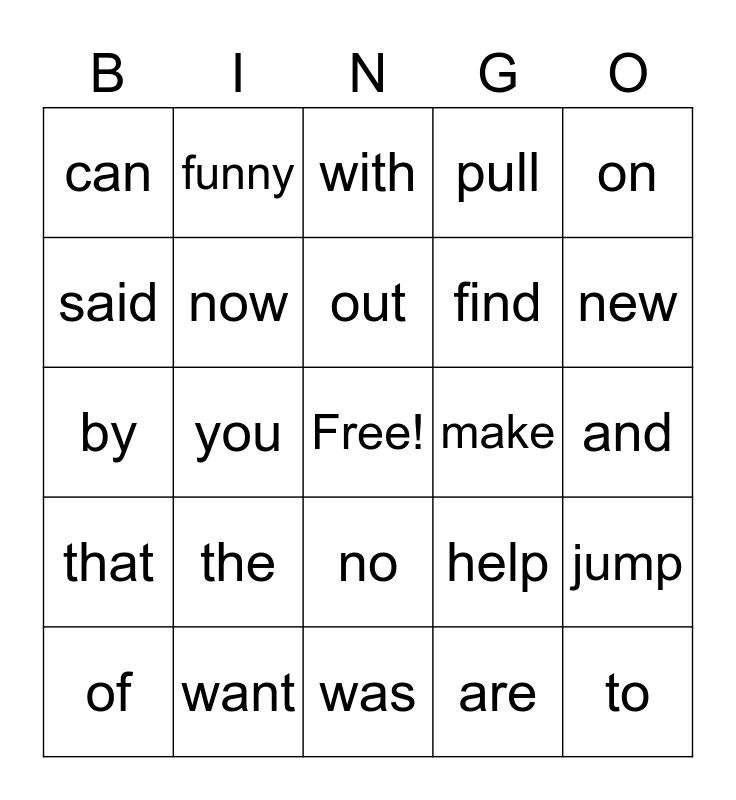 This bingo card has a free space and 27 words: help, they, find, was, said, with, funny, that, make, jump, by, pull, of, want, new, one, now, out, the, can, and, are, you, to, no, on and not.