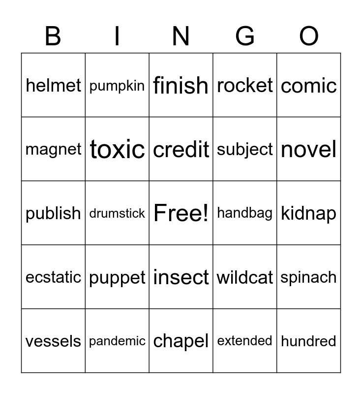 This bingo card has a free space and 80 words: topic, exit, finish, shellfish, wagon, ribbon, gallon, album, lesson, attic, melon, salad, rocket, helmet, basket, magnet, jacket, puppet, campus, kidnap, summit, comic, publish, credit, toxic, canvas, custom, model, anthem, sandal, novel, signal, chapel, models, vessels, handbag, fishpond, grandchild, chipmunk, hundred, dentist, actress, sandwich, address, traffic, pumpkin, children, pretzel, problem, dragon, spinach, drumstick, wildcat, freshman, classic, abstract, conflict, suspect, addict, insect, subject, district, collect, athletic, basketball, thanksgiving, volcanic, intellect, quintuplet, magnetic, ecstatic, pandemic, folded, swinging, talented, expanding, extended, discounted, finishing and Atlantic.