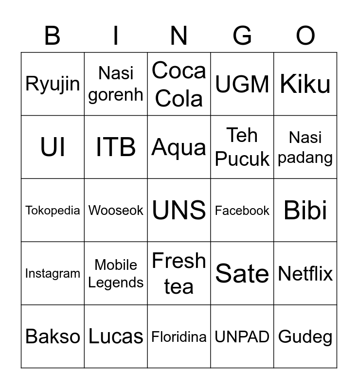This bingo card has a free space and 24 words: Mobile Legends, Lucas, Aqua, Bakso, Kiku, Ryujin, UI, Nasi gorenh, Facebook, Fresh tea, Teh Pucuk, Tokopedia, Sate, Netflix, ITB, UNPAD, Bibi, Coca Cola, Nasi padang, Wooseok, Gudeg, Instagram, UGM and Floridina.