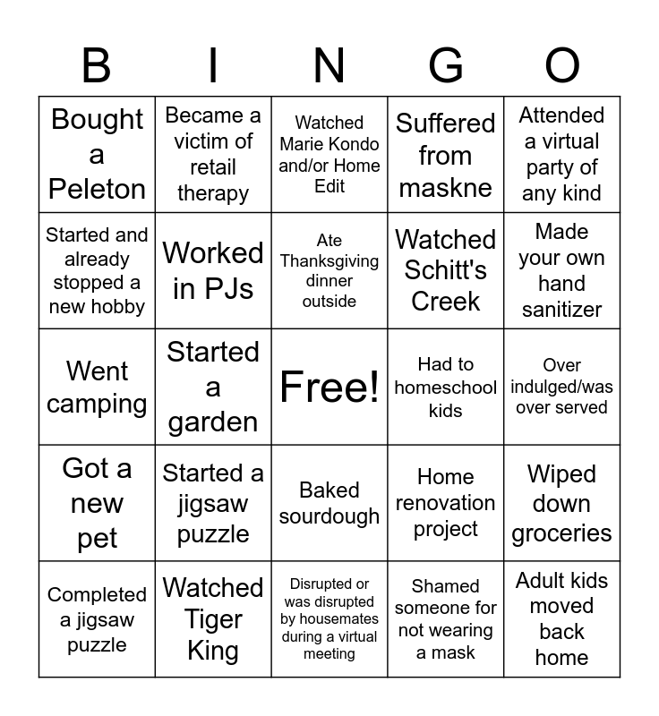 This bingo card has a free space and 24 words: Started a jigsaw puzzle, Watched Tiger King, Ate Thanksgiving dinner outside, Completed a jigsaw puzzle, Attended a virtual party of any kind, Bought a Peleton, Started and already stopped a new hobby, Became a victim of retail therapy, Had to homeschool kids, Baked sourdough, Watched Schitt's Creek, Went camping, Home renovation project, Wiped down groceries, Worked in PJs, Shamed someone for not wearing a mask, Over indulged/was over served, Watched Marie Kondo and/or Home Edit, Made your own hand sanitizer, Started a garden, Adult kids moved back home, Got a new pet, Suffered from maskne and Disrupted or was disrupted by housemates during a virtual meeting.