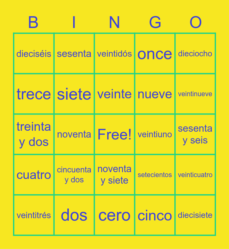 This bingo card has a free space and 59 words: uno, dos, tres, cuatro, cinco, seis, siete, ocho, nueve, diez, once, doce, trece, catorce, quince, dieciséis, diecisiete, dieciocho, diecinueve, veinte, veintiuno, veintidós, veintitrés, veinticuatro, veinticinco, veintiséis, veintisiete, veintiocho, veintinueve, treinta, treinta y uno, cuarenta, cuarenta y uno, cincuenta, sesenta, setenta, ochenta, noventa, cien, treinta y dos, cincuenta y uno, cincuenta y dos, sesenta y seis, setenta y cinco, setenta y seis, setenta y siete, ochenta y tres, noventa y seis, noventa y siete, cero, doscientos, trescientos, cuatrocientos, quinientos, seiscientos, setecientos, ochocientos, novecientos and mil.