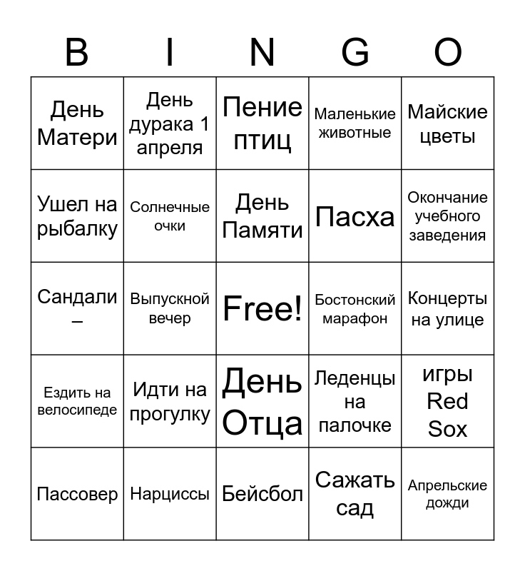 This bingo card has a free space and 26 words: День Отца, Сажать сад, День Памяти, Нарциссы, Майские цветы, День Матери, Ушел на рыбалку, День дурака 1 апреля, Концерты на улице, Леденцы на палочке, Пасха, Сандали –, игры Red Sox, Пассовер, Выпускной вечер, Запускать змея, Маленькие животные, Ездить на велосипеде, Пение птиц, Апрельские дожди, Окончание учебного заведения, Бейсбол, Бостонский марафон, Идти на прогулку, Солнечные очки and Весенние каникулы.