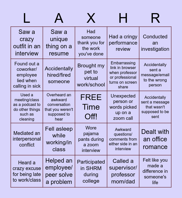 This bingo card has a free space and 24 words: Fell asleep while working/in class, Helped an employee/ peer solve a problem, Brought my pet to virtual work/school, Heard a crazy excuse for being late to work/class, Conducted an investigation, Saw a crazy outfit in an interview, Found out a coworker/ employee lied when calling in sick, Saw a unique thing on a resume, Unexpected person or words picked up on a zoom call, Wore pajama pants during a zoom interview, Embarrassing link in browser when professor or professional turns on screen share, Used a meeting/class as a podcast to do other things such as cleaning, Awkward questions/ comments from either side in an interview, Dealt with an office romance, Accidentally hired/fired someone, Called a supervisor/ professor mom/dad, Accidentally sent a message that wasn't supposed to be sent, Had someone thank you for the work you've done, Accidentally sent a message/email to the wrong person, Overheard an awkward conversation that you weren't supposed to hear, Felt like you made a difference in someone's life, Mediated an interpersonal conflict, Had a cringy performance review and Participated in SHRM during college.