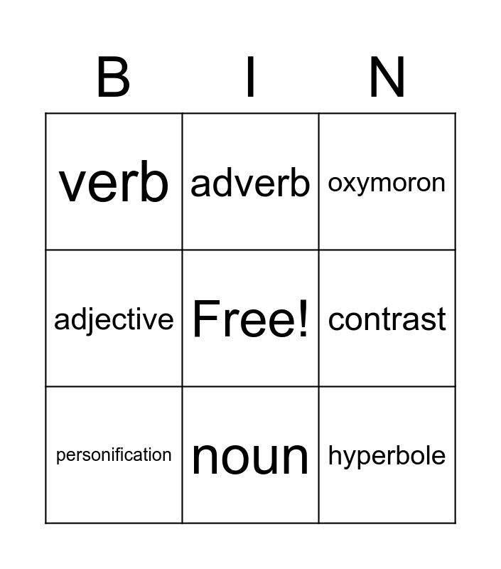 This bingo card has a free space and 14 words: simile, metaphor, personification, adverb, adjective, hyperbole, repetition, onomatopoeia, noun, verb, rule of three, contrast, oxymoron and symbolism.