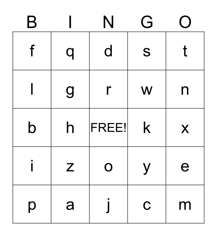 This bingo card has a free space and 24 words: z, a, r, p, t, f, l, q, k, o, w, b, y, e, g, c, x, d, n, h, m, i, s and j.