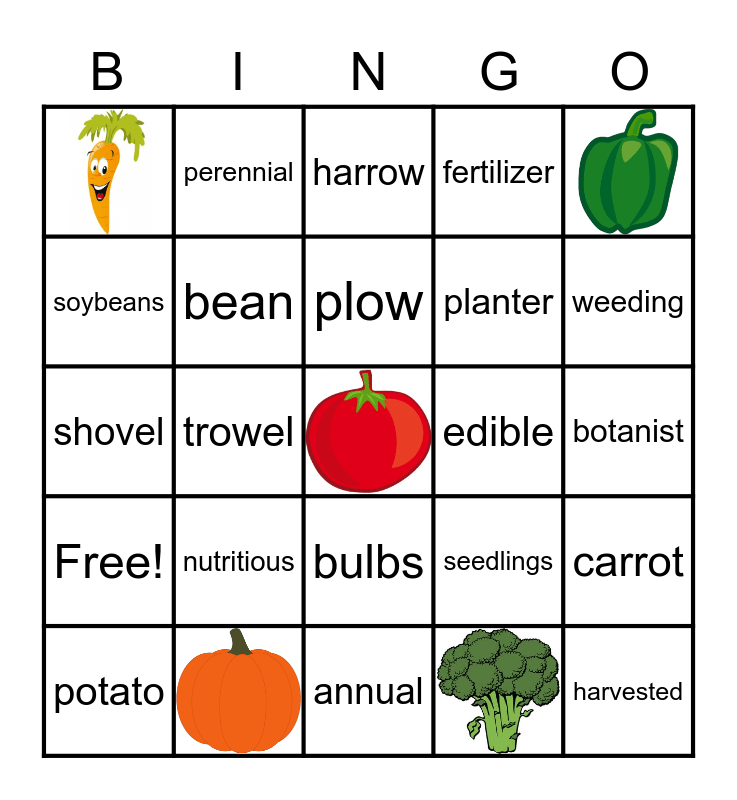 This bingo card has 5 images and 20 words: Free!, perennial, harrow, edible, carrot, soybeans, bean, annual, seedlings, weeding, potato, trowel, plow, planter, botanist, shovel, nutritious, bulbs, fertilizer and harvested.