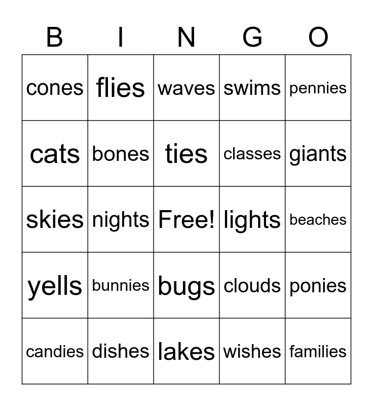 This bingo card has a free space and 24 words: bunnies, dishes, ties, candies, pennies, cones, cats, flies, lights, bugs, classes, skies, clouds, ponies, bones, wishes, beaches, waves, giants, nights, families, yells, swims and lakes.