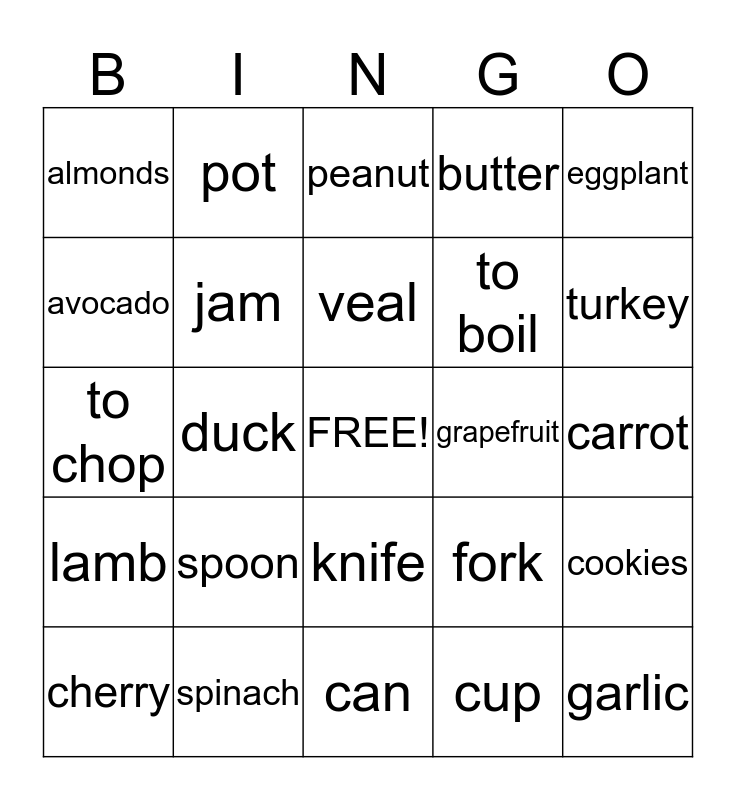 This bingo card has a free space and 24 words: spoon, spinach, veal, cherry, eggplant, almonds, avocado, pot, grapefruit, knife, to boil, to chop, fork, cookies, jam, cup, carrot, peanut, turkey, duck, garlic, lamb, butter and can.