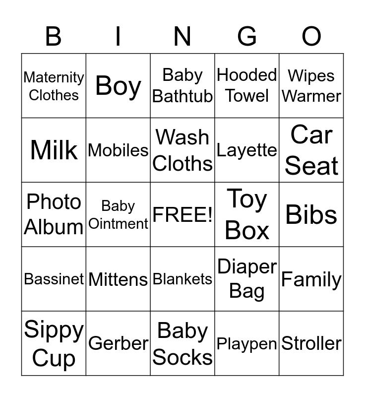 This bingo card has a free space and 24 words: Mittens, Gerber, Wash Cloths, Sippy Cup, Wipes Warmer, Maternity Clothes, Milk, Boy, Toy Box, Blankets, Layette, Photo Album, Diaper Bag, Family, Mobiles, Playpen, Bibs, Baby Bathtub, Car Seat, Baby Ointment, Stroller, Bassinet, Hooded Towel and Baby Socks.