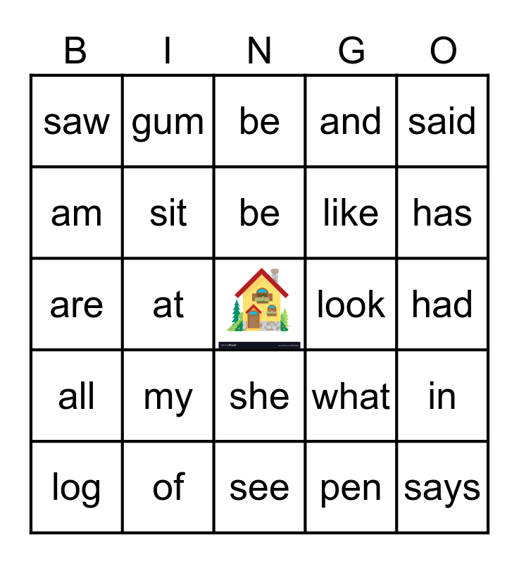This bingo card has a free space and 24 words: my, of, be, log, said, saw, am, gum, look, she, like, are, what, in, sit, pen, had, be, has, at, says, all, and and see.