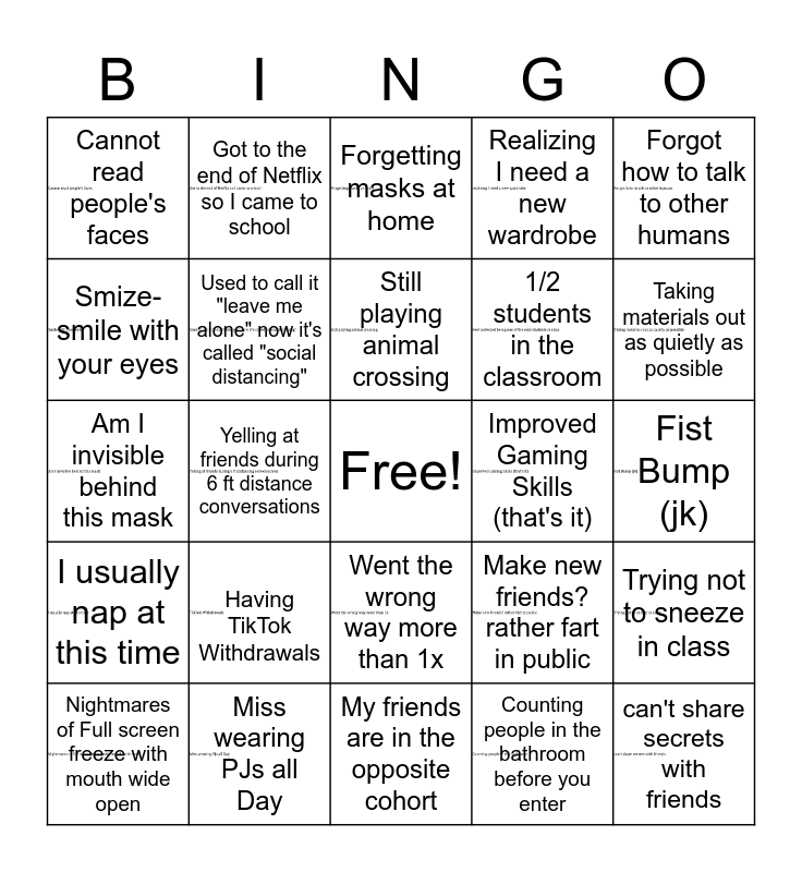 This bingo card has 23 images, a free space and 24 words: Having TikTok Withdrawals, Miss wearing PJs all Day, Still playing animal crossing, Nightmares of Full screen freeze with mouth wide open, Forgot how to talk to other humans, Cannot read people's faces, Smize-smile with your eyes, Got to the end of Netflix so I came to school, Improved Gaming Skills (that's it), Went the wrong way more than 1x, 1/2 students in the classroom, Am I invisible behind this mask, Make new friends? rather fart in public, Trying not to sneeze in class, Used to call it "leave me alone" now it's called "social distancing", Counting people in the bathroom before you enter, Fist Bump (jk), Forgetting masks at home, Taking materials out as quietly as possible, Yelling at friends during 6 ft distance conversations, can't share secrets with friends, I usually nap at this time, Realizing I need a new wardrobe and My friends are in the opposite cohort.