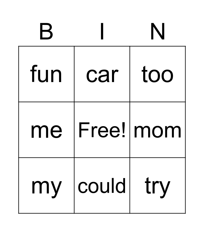 This bingo card has a free space and 15 words: can, do, too, fun, could, try, fine, ok, mom, dad, see, me, my, car and bus.