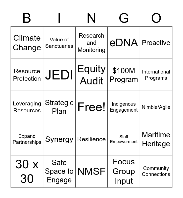 This bingo card has a free space and 24 words: Synergy, Safe Space to Engage, Equity Audit, 30 x 30, Proactive, Climate Change, Resource Protection, Value of Sanctuaries, Indigenous Engagement, Resilience, $100M Program, Leveraging Resources, Staff Empowerment, Maritime Heritage, JEDI, Focus Group Input, Nimble/Agile, Research and Monitoring, International Programs, Strategic Plan, Community Connections, Expand Partnerships, eDNA and NMSF.