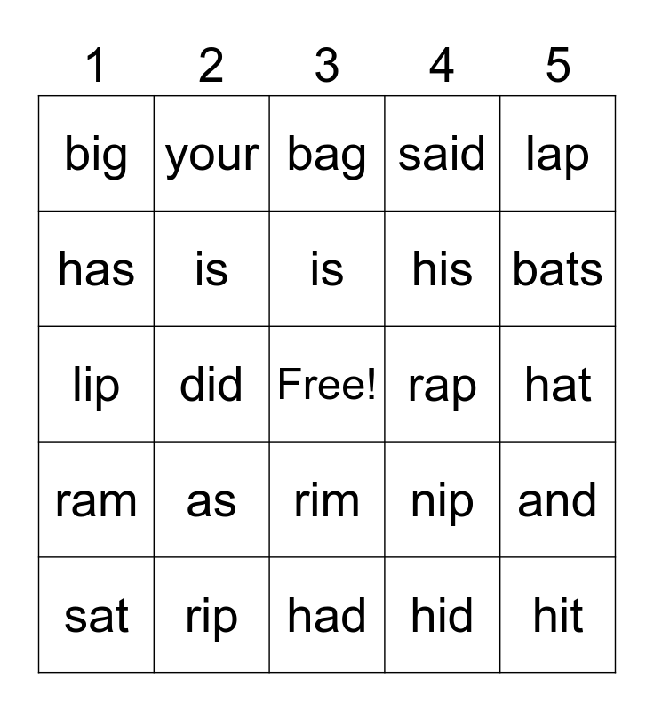This bingo card has a free space and 29 words: sat, sit, did, dad, big, bag, is, as, rap, rip, hat, hit, had, hid, bats, bits, rim, ram, lap, lip, nip, nap, his, has, said, your, and, is and the.
