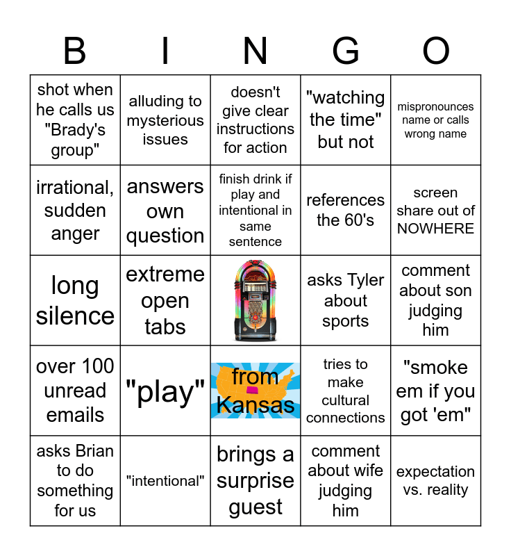 This bingo card has 1 images, a free space and 24 words: "play", "intentional", finish drink if play and intentional in same sentence, asks Brian to do something for us, mispronounces name or calls wrong name, shot when he calls us "Brady's group", irrational, sudden anger, alluding to mysterious issues, asks Tyler about sports, from Kansas, references the 60's, long silence, tries to make cultural connections, "smoke em if you got 'em", answers own question, comment about wife judging him, comment about son judging him, doesn't give clear instructions for action, screen share out of NOWHERE, extreme open tabs, expectation vs. reality, over 100 unread emails, "watching the time" but not and brings a surprise guest.