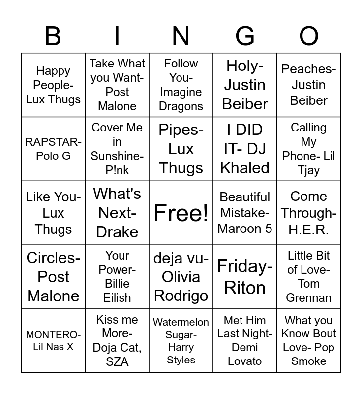 This bingo card has a free space and 24 words: Your Power- Billie Eilish, Kiss me More- Doja Cat, SZA, Pipes- Lux Thugs, MONTERO- Lil Nas X, Peaches- Justin Beiber, Happy People- Lux Thugs, RAPSTAR- Polo G, Take What you Want- Post Malone, Beautiful Mistake- Maroon 5, deja vu- Olivia Rodrigo, I DID IT- DJ Khaled, Like You- Lux Thugs, Friday- Riton, Little Bit of Love- Tom Grennan, Cover Me in Sunshine- P!nk, Met Him Last Night- Demi Lovato, Come Through- H.E.R., Follow You- Imagine Dragons, Calling My Phone- Lil Tjay, What's Next- Drake, What you Know Bout Love- Pop Smoke, Circles- Post Malone, Holy- Justin Beiber and Watermelon Sugar- Harry Styles.